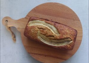 Doe het mengsel in de cakevorm. Snij de laatste banaan door midden en leg bovenop. Bak 45-55 min. op 175 graden.